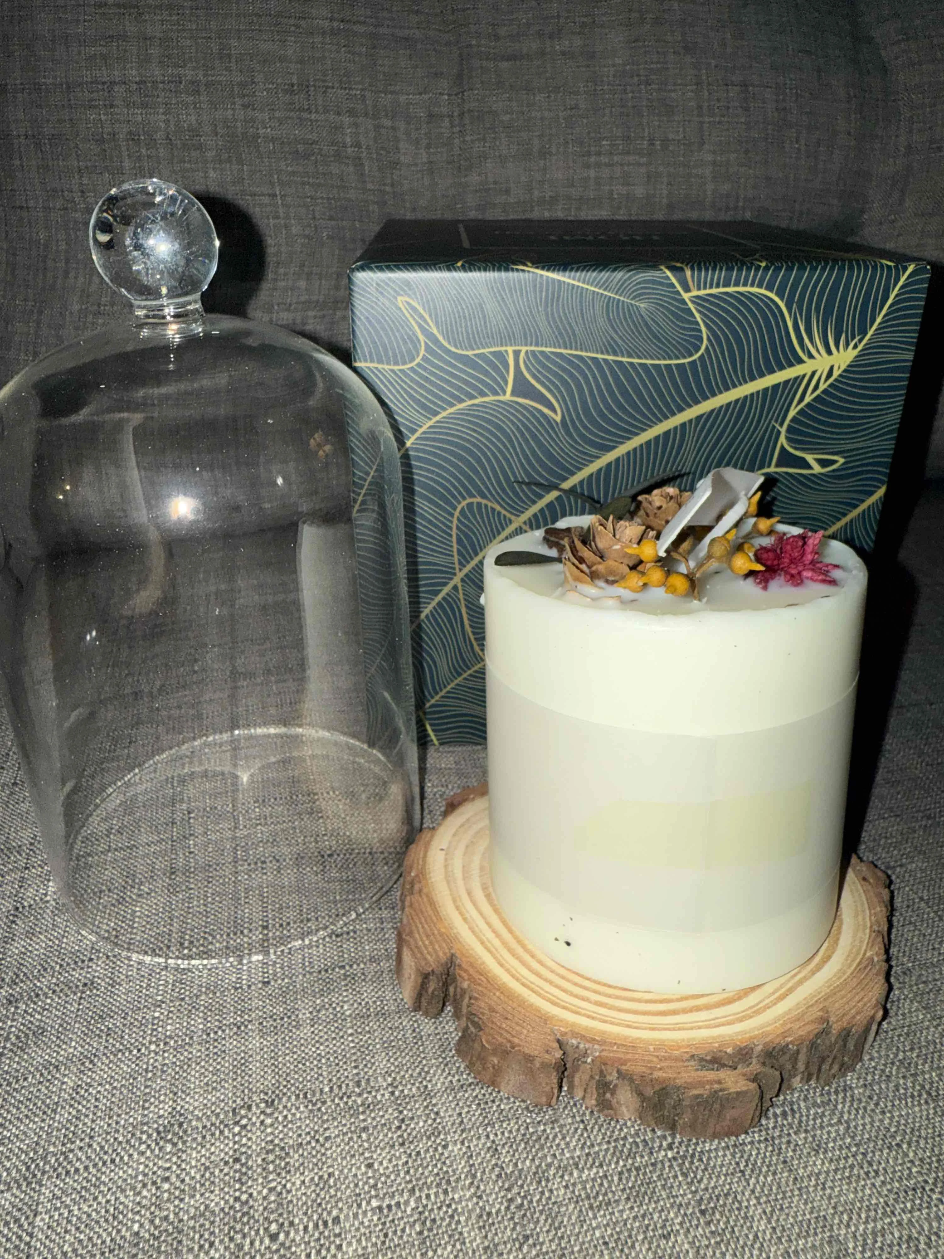 Özelleştirilebilir Logo Nordic soya balmumu aromatik mumlar doğum günü düğün cam kubbe kurutulmuş çiçekler meyve kokulu mum pamuk